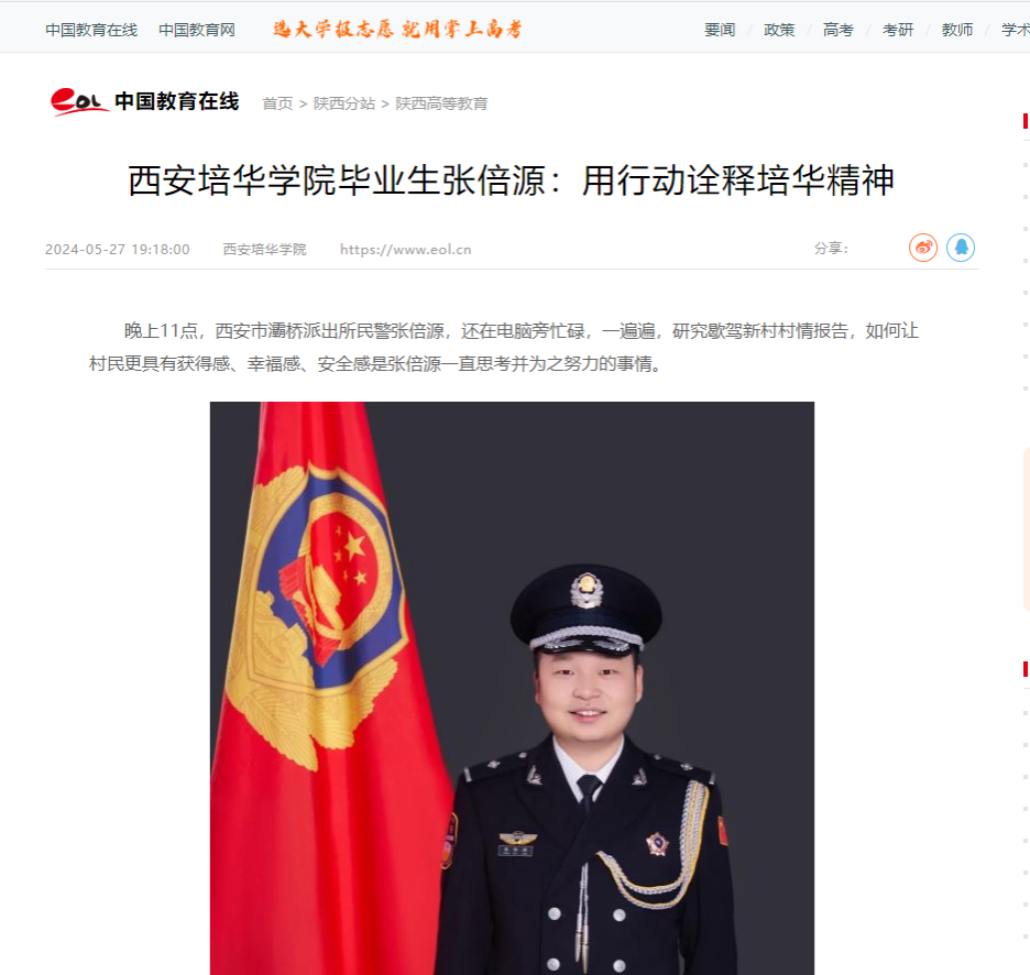 张倍源是西安培华学院2019届法学专业毕业生,现在是,灞桥派出所四级警长,也是歇驾新村警务室民警,当警察,是很多人的梦想,张倍源也不例外,为了这个梦想,他一直努力着,大学时期的他,不仅学习成绩名列前茅,还是优秀的学生干部,被共青团陕西省委评为“社会实践先进个人”,被共青团中央评为“强国一代新青年”。
