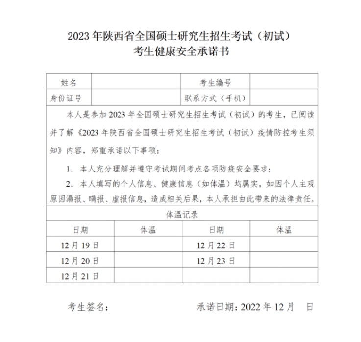 3.考生下载《2023年陕西省全国硕士研究生招生考试(初试)考生健康安全承诺书》,于12月19日至23日每日进行体温测量、记录和健康状况监测,考前自行打印并签字确认。