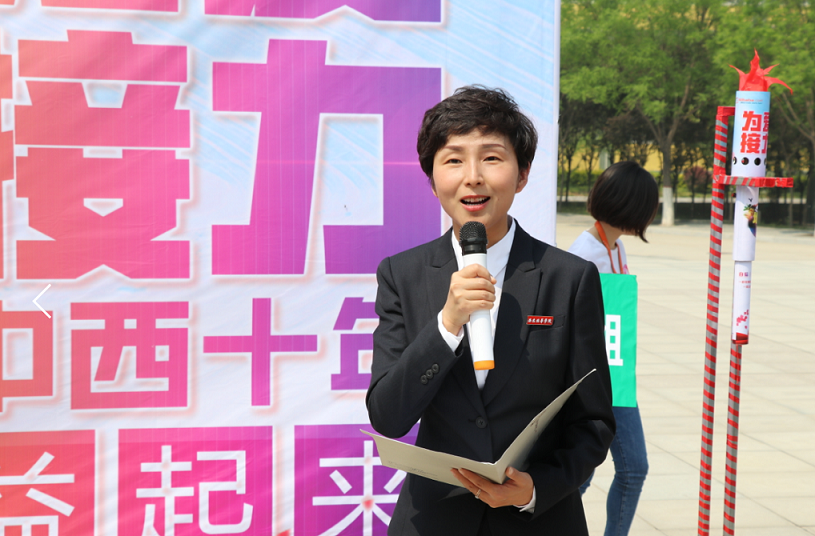 西安培华学院女子学院副院长、地球奖获得者、西安市环境大使、班理致词,她在致词中诚恳地讲到,自她参与环境保护的志愿者工作开始,一直投身于国家西部大开发战略宣传当中,鼓励大家从点滴做起,组织妇女儿童立足社区,参与发展生态农业,举办青年环境论坛,倡导植树种草,响应号召,以生态环境保护为根本,为地球的长久发展贡献个人力量。最后她带领同学们做手势舞:双手拇指、食指相扣,形成一个心,并高呼朗读:珍惜自然资源、呵护美丽国土,以此唤醒人们对自然的敬畏与爱意。
