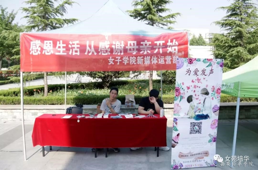 为纪念母亲节这个具有非凡意义的日子的。西安培华学院女子学院于 2018 年 5 月 16日 在综合楼广场举办了感恩母亲系列活动:“感谢生活,从感恩母亲开始”,通过现场活动的开展,加强了学生们的‘三感’(感动、感激、感恩)教育”。