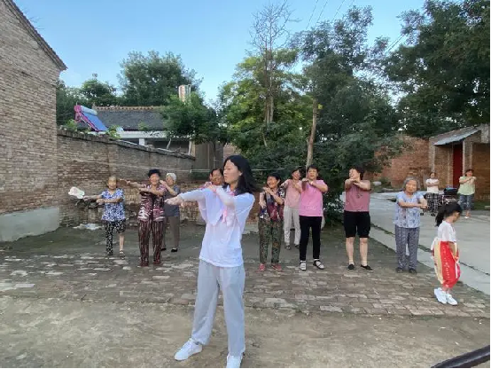 西安培华学院“南丁格尔护理志愿者服务队”的成员教村民跳健康操