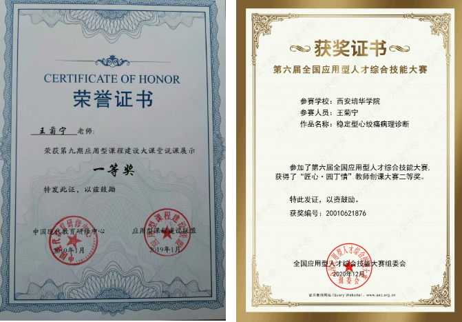 二十一载耕耘,团队课程《病理学》荣获陕西省“双万计划”一流本科课程、团队先后获陕西省课程思政精品示范课和示范团队、陕西高等教育优秀教材二等奖、陕西省科学技术进步奖三等奖、陕西省科学技术研究优秀成果奖;获批校级首批应用型示范课、课程思政优质示范课、精品课程、校企合作课程;获教育部应用型课程说课大赛及全国专业教学类赛事一等奖3项、校级教学成果一等奖2项……