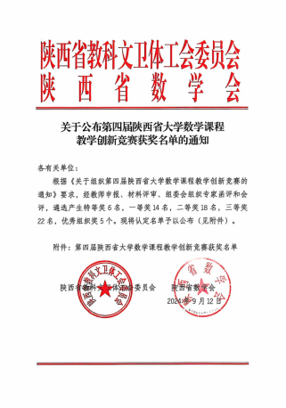 9月 20 日,根据陕西省教科文卫体工会委员会、陕西省数学学会发布的第四届陕西省大学数学课程教学创新竞赛获奖文件获知,西安培华学院智能科学与工程学院基础系数学教研室邢瑞芳副教授斩获竞赛一等奖。