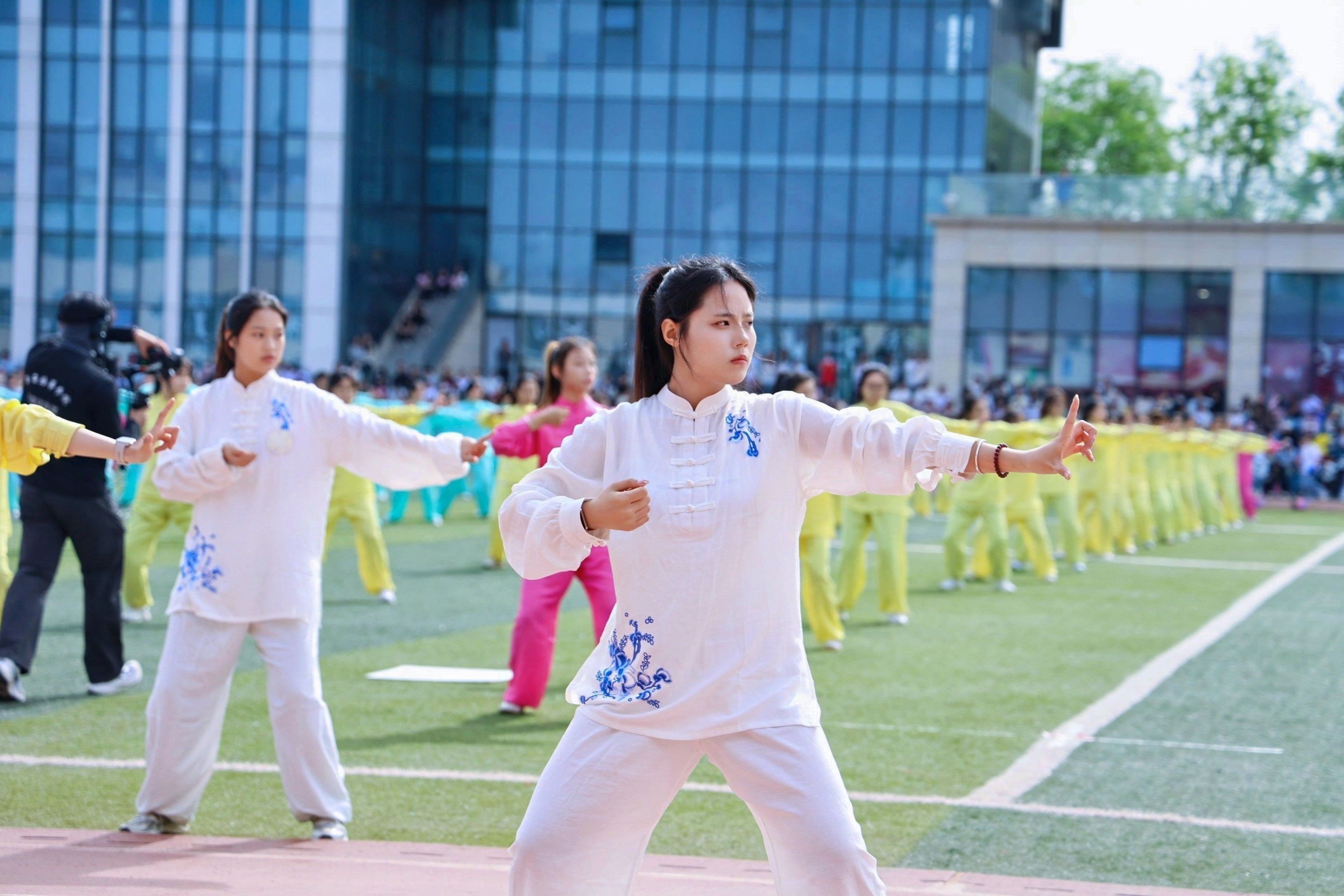 教职工方队化身粉色浪潮,144双手共绘樱花海,老师们秒变追风舞者,团队协作默契满分,欢笑与汗水交织成最萌年龄差表演。