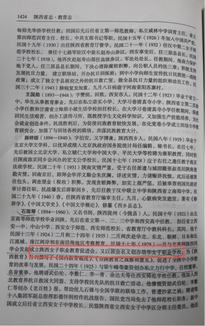 中华人民共和国地方志丛书《陕西省志-教育志》中记载吴云芳、梁午峰、石雨琴等人举办了西安第一女子平民职业学校(后改名培华女子职业学校)的事迹