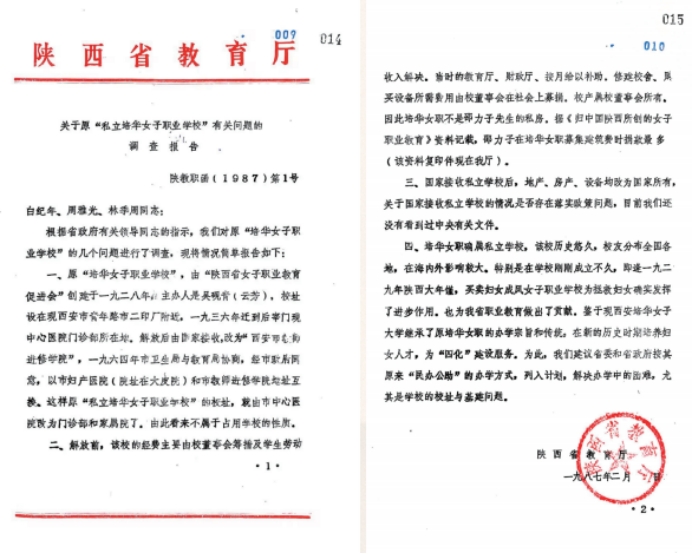 陕西省教育厅1987年2月给时任陕西省委书记白纪年、省委副书记周雅光、陕西省政府副省长林季周关于培华历史脉络的报告