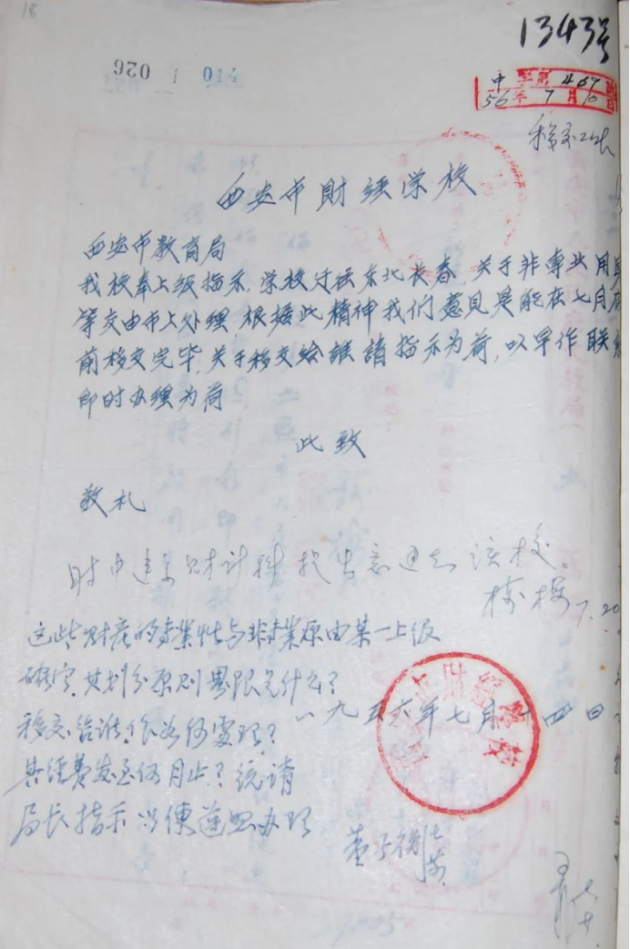 1956年7月,西安市财经学校向西安市教育局报告,准备迁往东北长春。报告中记录迁校原因为“上级指示”