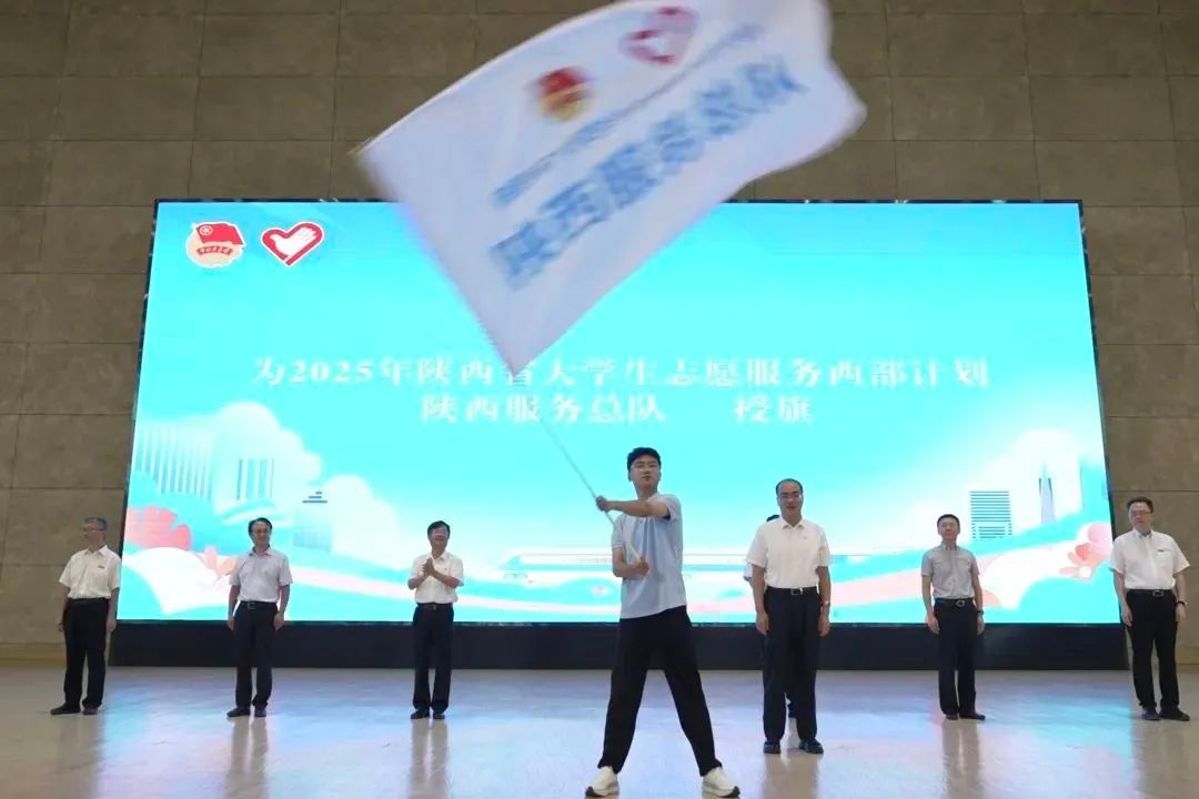 出征仪式上,与会领导为2025年新招募在陕服务西部计划志愿者赠送出征装备,为2025年陕西省大学生志愿服务西部计划陕西服务总队和各服务分队授旗,全体西部计划志愿者庄严宣誓,集体发出了“清澈的爱,只为中国”的青春誓言。