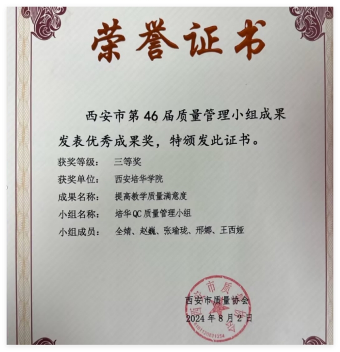 西安培华学院QC质量管理小组荣获“西安市第46届质量管理小组优秀成果奖”