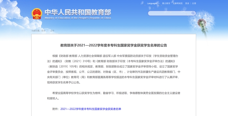 近日,教育部网站公布了《2021—2022学年度本专科生国家奖学金获奖学生名单》。其中,西安培华学院共有25名优秀学子获得2021—2022学年度本专科生国家奖学金。