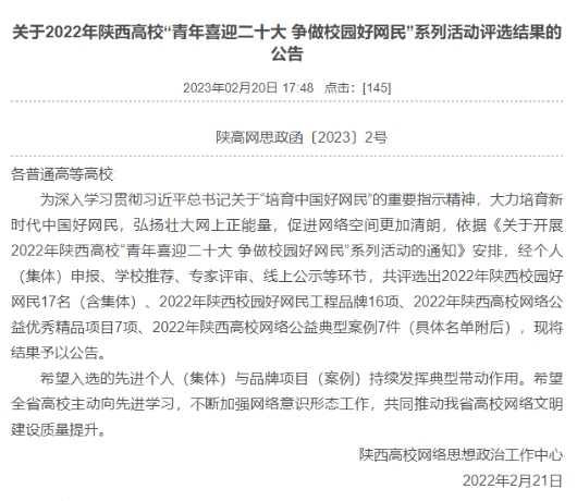 为深入学习贯彻习近平总书记关于“培育中国好网民”的重要指示精神,大力培育新时代中国好网民,弘扬网络正能量,促进网络空间更加清朗,依据《关于开展2022年陕西高校“青年喜迎二十大 争做校园好网民”系列活动的通知》安排,经学校推荐、专家评审、线上公示等环节,学校党委学工部部长蔡亮负责的《打造思政品牌培育新时代培华好网民——西安培华学院“姜维之班”创建工作纪实》项目荣获2022年陕西校园好网民工程品牌。