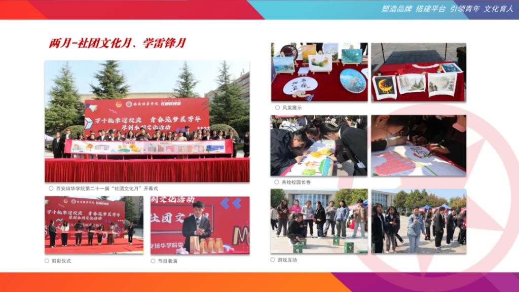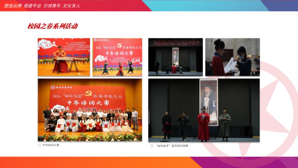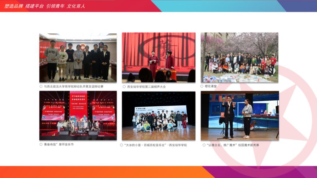 校园文化是高校青年学生第二课堂的重要组成部分,也是唤起青年一代独立的人格追求和高尚的道德追求。西安培华学院共青团组织构建了“三节、两月、两平台、两工程、两计划”的第二课堂活动体系”,推进校园文化建设,不断丰富校园文化生活,打造系列品牌活动。在各类的校园文化活动中,各级团组织发挥专业优势,展现不一样的青春风采,培育各类形式多样、内容丰富的校园文化活动,进一步推动以文化人,从不同维度加强对青年学生思想引领,促进学生德智体美劳全面发展。