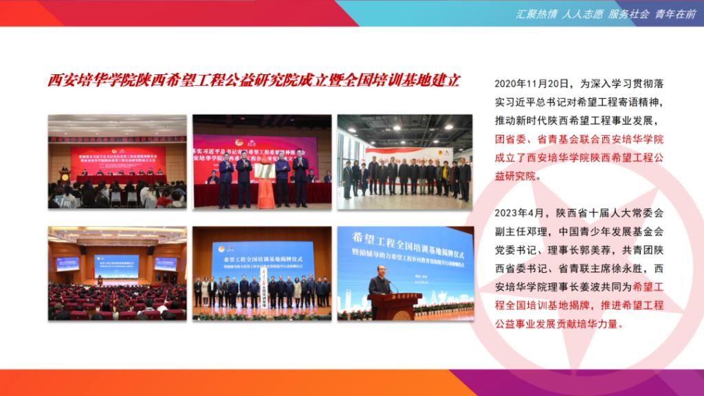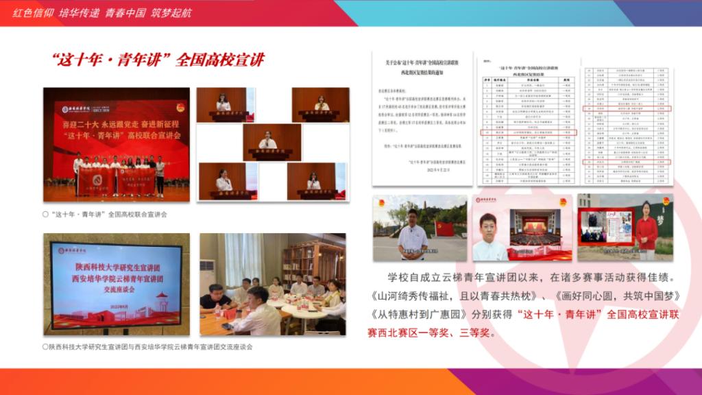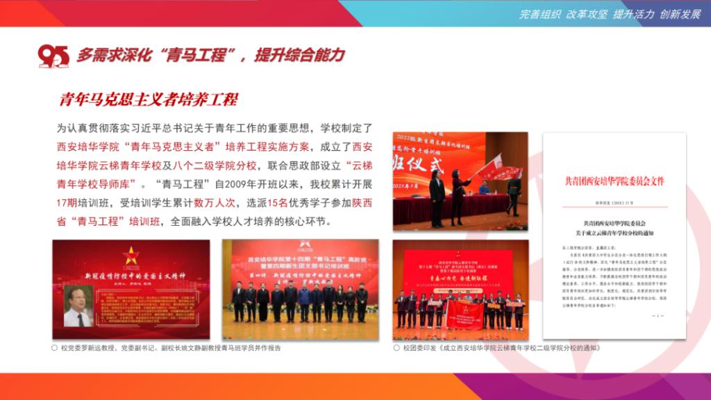 共青团西安培华学院委员会组织带领广大团员青年深入学习党的二十大精神,紧密团结在以习近平同志为核心的党中央周围,继续奋斗,不忘初心,砥砺前行,旗帜鲜明的引领广大团员青年坚定不移听党话、跟党走,紧紧围绕立德树人根本任务,引导学生树立坚定正确的理想信念,用理论宣讲武装青年、以“青马工程”培育青年、以先进典型感召青年。