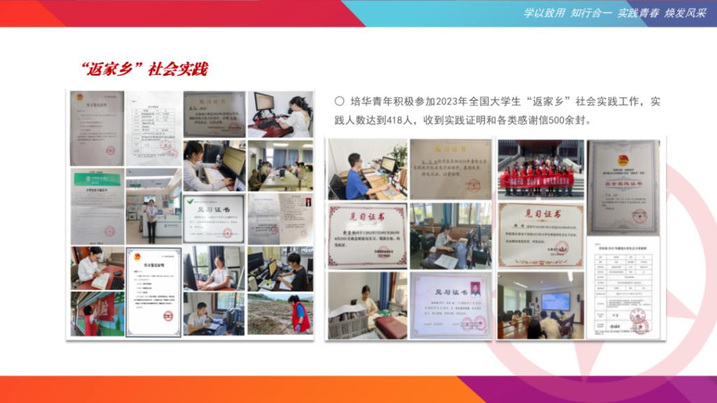 习近平总书记寄语广大青年,“要坚定不移听党话、跟党走,怀抱梦想又脚踏实地,敢想敢为又善作善成,立志做有理想、敢担当、能吃苦、肯奋斗的新时代好青年”。这是党对青年的殷殷期盼,这是国家对青年的深深呼唤。学校以学生发展为中心,着力打造“专业+实践”的培养模式,将社会实践项目化、基地化、社会化,鼓励培华青年立足实践,走进基层,将青春汗水挥洒在祖国大地上,谱写属于培华青年的时代华章。