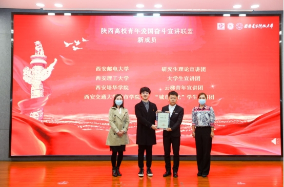 会上,我校云梯青年宣讲团受聘成为陕西高校青年爱国奋斗宣讲联盟新成员,宣讲团负责人员泽阳接受证书,校团委副书记杨媛老师上台见证。