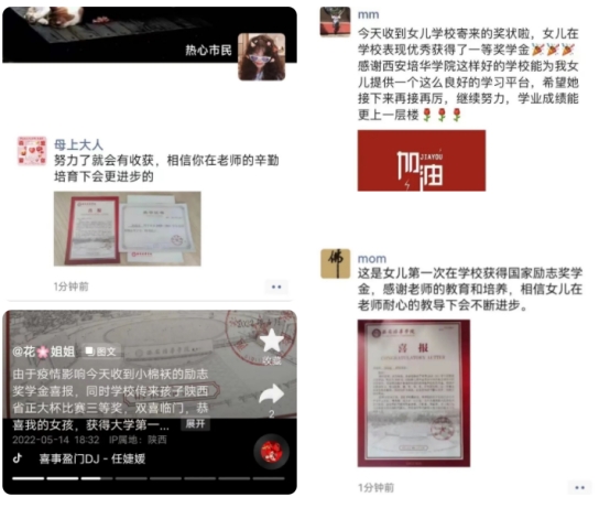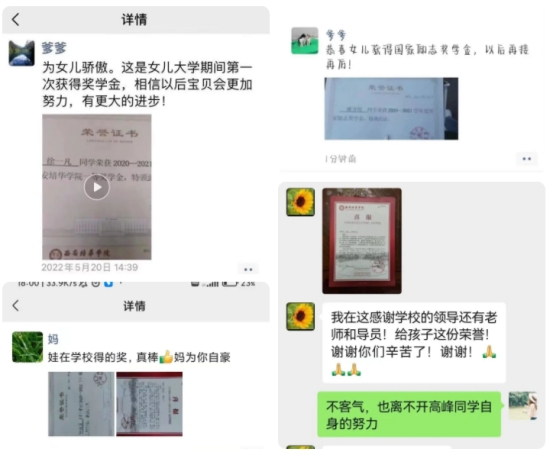 看到孩子的进步是家长们最开心的时刻,通过晒照、分享,家长们表达自己的喜悦和激动。王祺加家长表示:喜报千里迢迢从西北到达东南,送来了孩子的荣誉。作为家长,收到学校这么大的礼包,我们非常惊喜。感谢西安培华学院的精心栽培,相信这四年本科生活,一定会给孩子留下终生难忘的记忆。