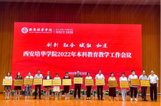 副校长刘越莲宣读《西安培华学院关于表彰高水平教学成果的通报》《西安培华学院关于表彰2021年度优秀校外实习基地的通报》。