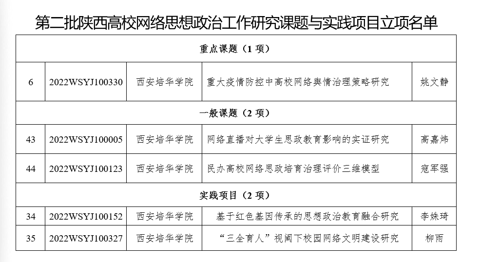 近日,陕西省委教育工委、陕西省教育厅对第二批陕西高校网络思想政治工作研究课题与实践项目立项结果进行公示,我校获批重点研究课题1项、一般研究课题2项、一般自筹实践项目2项,项目获批总数居于陕西民办高校首位。