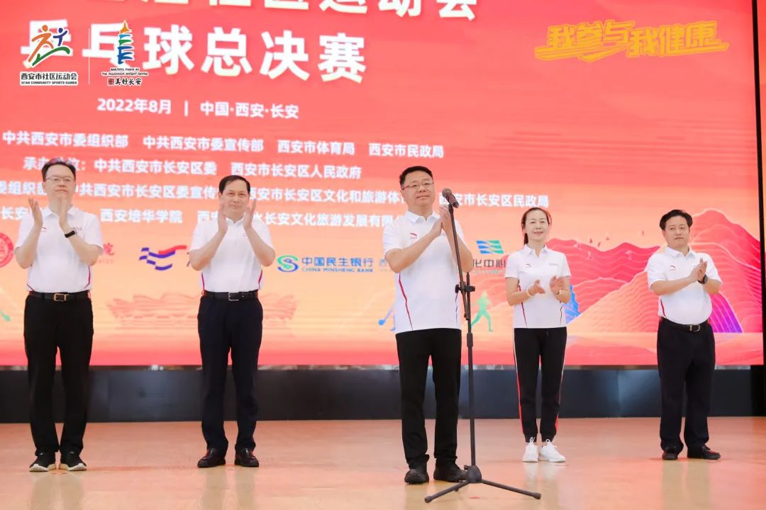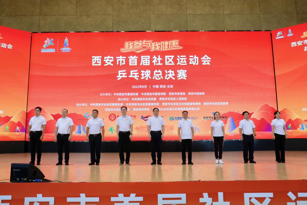 8月6日上午,西安市首届社区运动会乒乓球总决赛在西安培华学院体育馆开赛。本次比赛由中共西安市委组织部、中共西安市委宣传部、西安市体育局、西安市民政局主办,中共西安市长安区委、西安市长安区人民政府承办。中共西安市委组织部副部长、市公务员局局长张勇,长安区委书记吕强,长安区委副书记王韬,长安区委常委、组织部部长王宝金,长安区委常委、宣传部部长张文川,长安区人大常委会副主任葛莹,长安区政府副区长李立峰,西安培华学院理事长姜波出席开幕式。