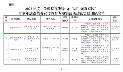 日前,共青团陕西省委发布了《关于确定2022年度“争做禁毒先锋守‘尉’无毒家园”青少年法治禁毒宣传教育专项实践活动获资助团队的通知》,,经评审组综合评定,共评选出一等资助3项、二等资助5项、三等资助22项,其中由学校推荐申报的《以青春之名,“培”你 健康成长》项目脱颖而出,荣获一等资助(5000元),位列全省资助项目第一名,这也是学校连续第三年获批专项资助。
