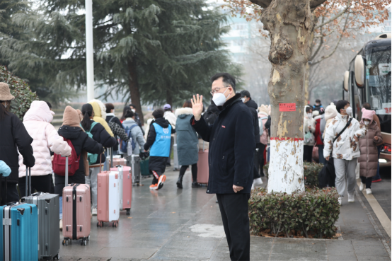在西安汽车站、高铁站,年余花甲的党委书记罗新远、校长李映方站在风雪中和同学们依依送别,叮嘱大家做好防护,路上注意安全,有困难随时联系学院的老师们,到家了向我们报一声平安。