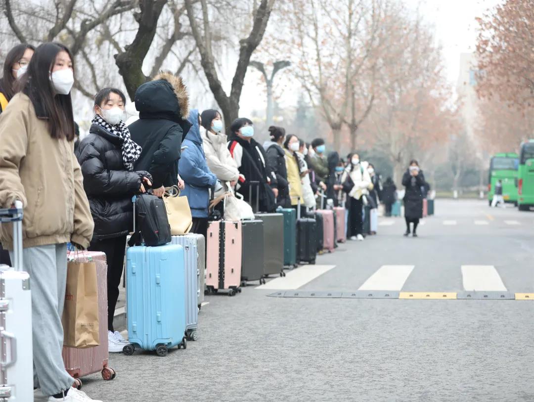21日凌晨的校园,格外热闹,一辆辆持有“专用通行证”的来自周边各地市、县的大巴车陆续来往于校园内,行李箱的轱辘声混杂着汽车轮胎摩擦地面的声音,大雪纷飞中,这场声势浩大的转运工作正式拉开序幕了,全体住校教职工站在鹅毛大雪中指挥学生排队上车,嗓子喊哑了、腿站麻了一直坚守到最后一名学子放好了行李坐上车。看着同学们飞快的步伐、脸上洋溢着笑容,这一切变得那么幸福而又温馨。