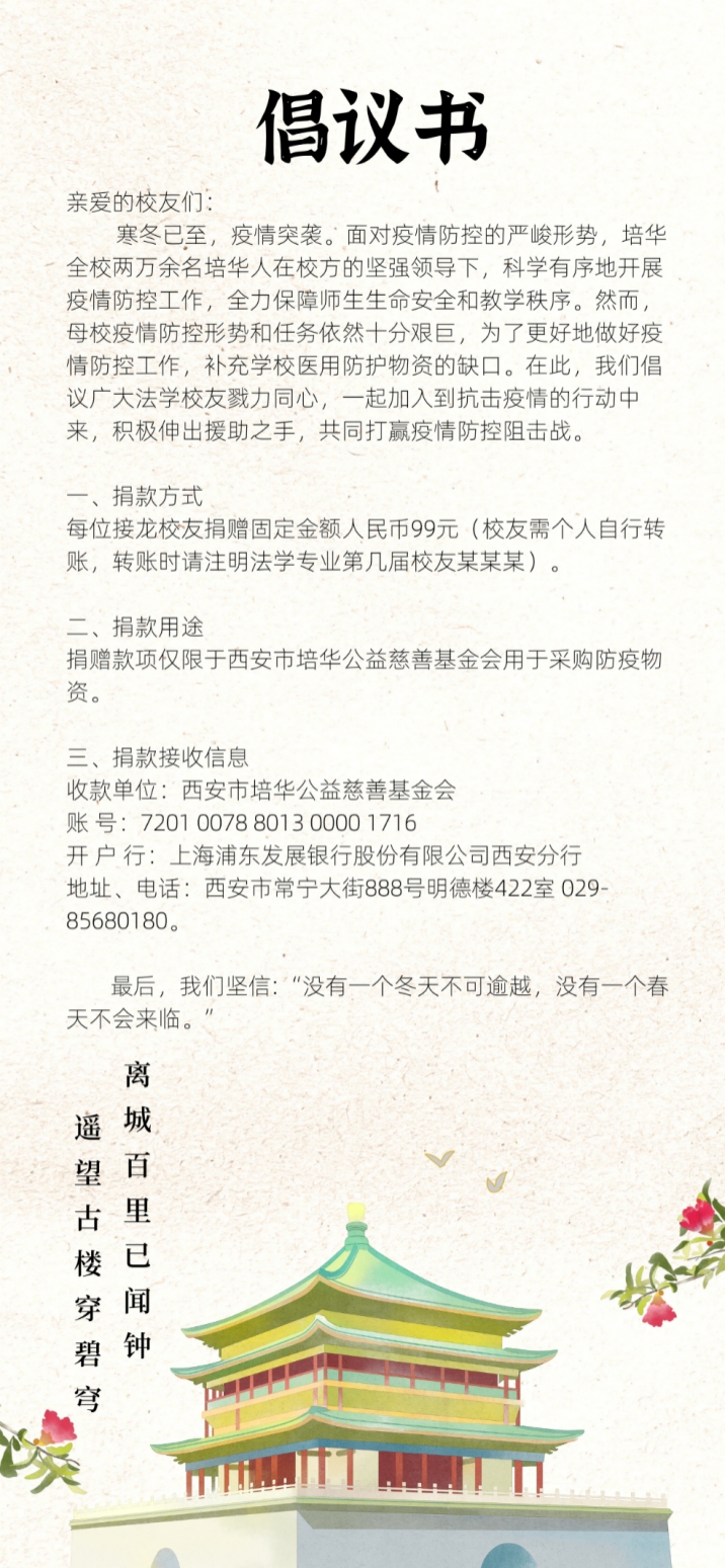 为全面打赢疫情防控阻击战,助力母校抗疫工作,西安培华学院法学专业校友会心系母校、积极行动,带着对母校深切的感恩眷念之情,自发组织为母校抗疫捐款。