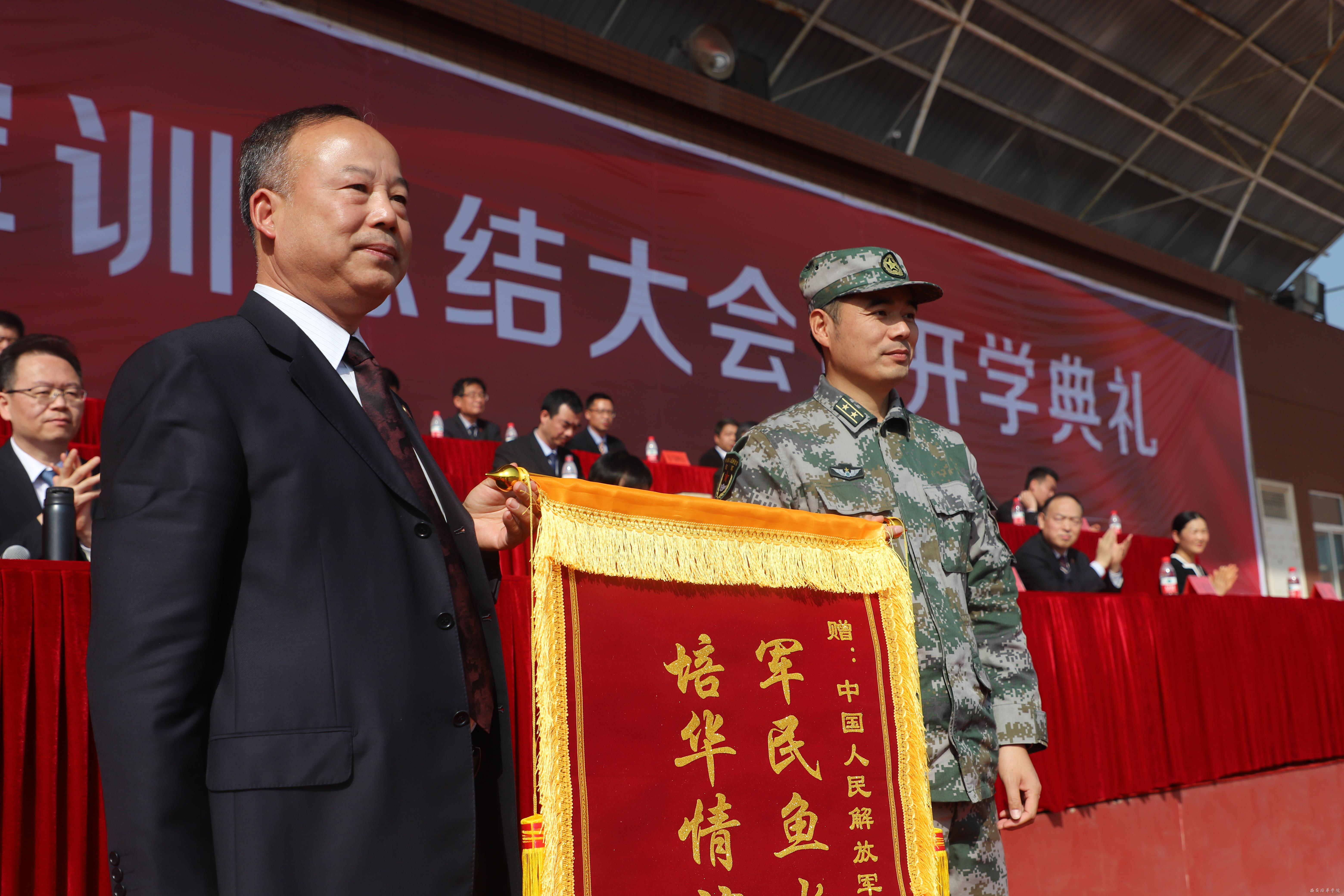 承担本次军训任务的全体教官以身作则、树立榜样,帮助同学们养成良好的行为习惯,赢得了全校师生的广泛好评。校党委书记罗新远向承训部队赠送锦旗,表示由衷的感谢。