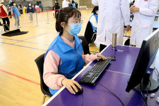 播音与主持艺术专业学生杨雅舒:现在我在负责内容登记,具体是录入接种师生的个人信息,接种完毕后还要进行网上确认,接种疫苗的批号、名称等信息就都会被统一录入系统中。这是在疫情防控期间第一次接触相关工作,感觉神经一直紧绷着,以高度的注意力,防止出现一丝差错。同时深深感觉到医务工作者工作的辛苦,如果下次有相关的志愿服务,我很乐意再加入进来。