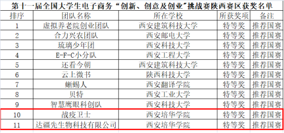 2021年6月5日,第十一届全国大学生电子商务“创新、创意及创业”挑战赛陕西赛区在西安工程大学临潼校区举办,本次大赛共有来自全省32所高校的3392支队伍参加。西安培华学院会计与金融学院关昊辰同学的项目《战疫卫士一一碳盾口罩》(指导老师:莫姣姣)、陈佳航的项目《达疆先中医药养生保健品牌策划方案》( 指导老师:吴军政),均获省级特等奖并入围国赛。