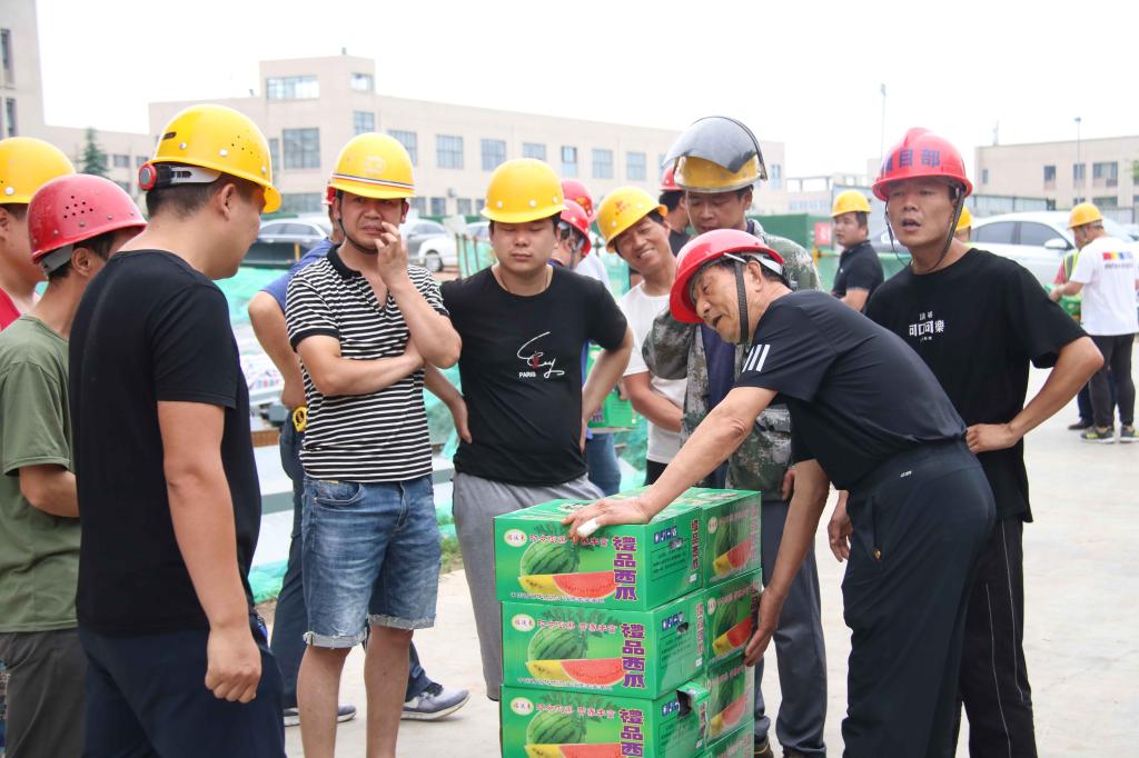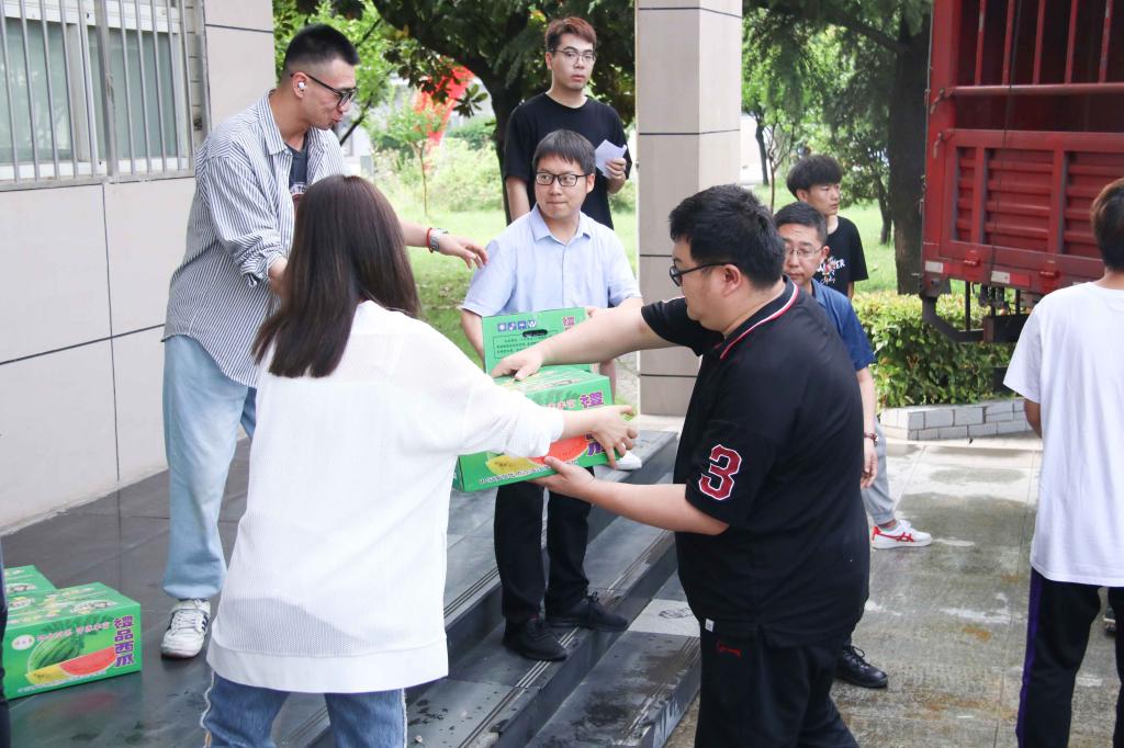 校长助理姜涛将400余斤西瓜等降温物资,送到了奋战在高温一线的基建人员手中,向他们表达祝福和感谢,并叮嘱工人时刻牢记高温季节施工安全注意事项,防止安全事故和高温中暑事件发生,确保人身安全。