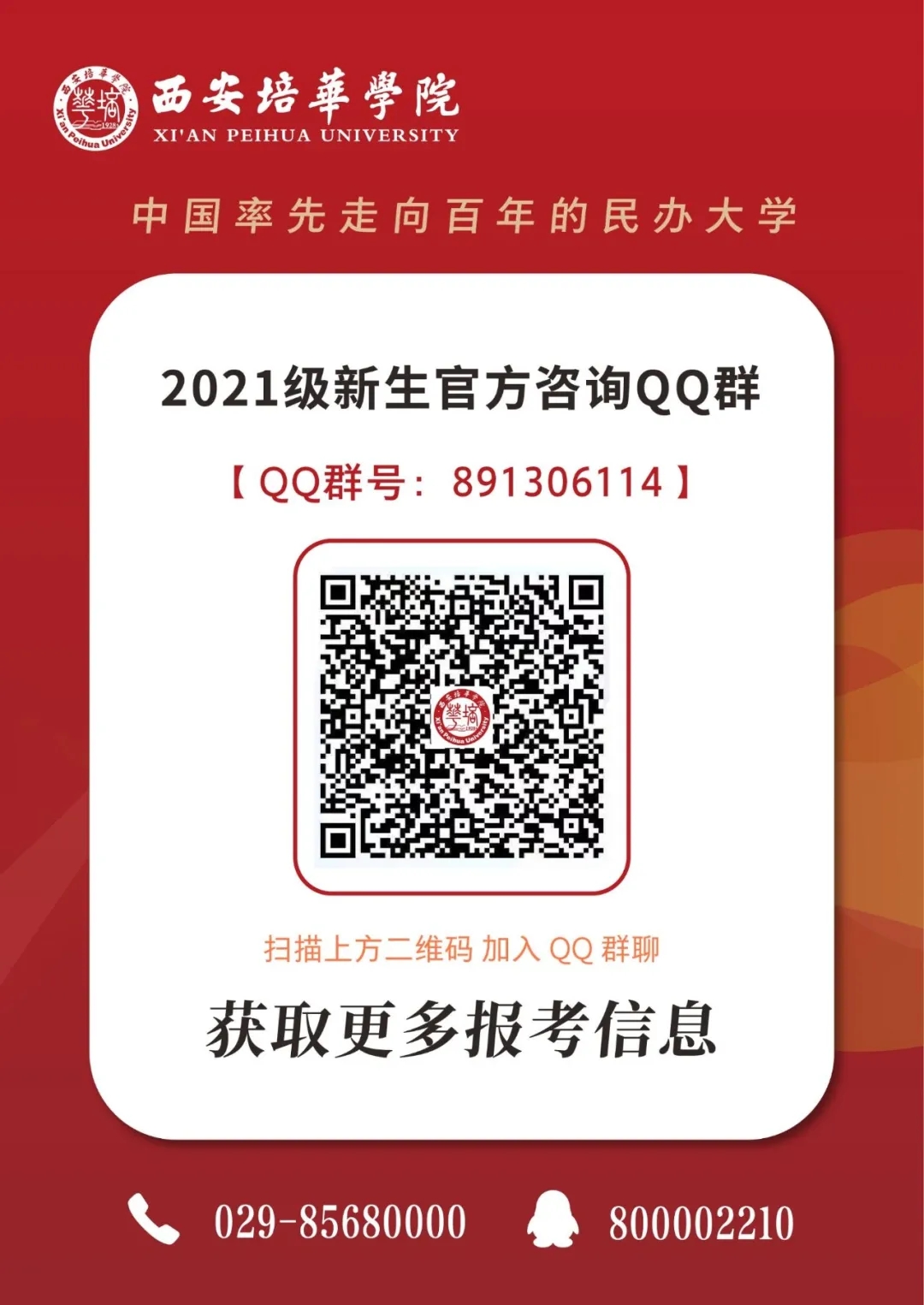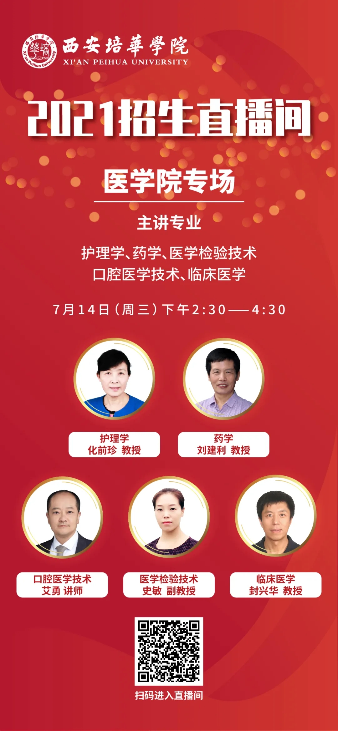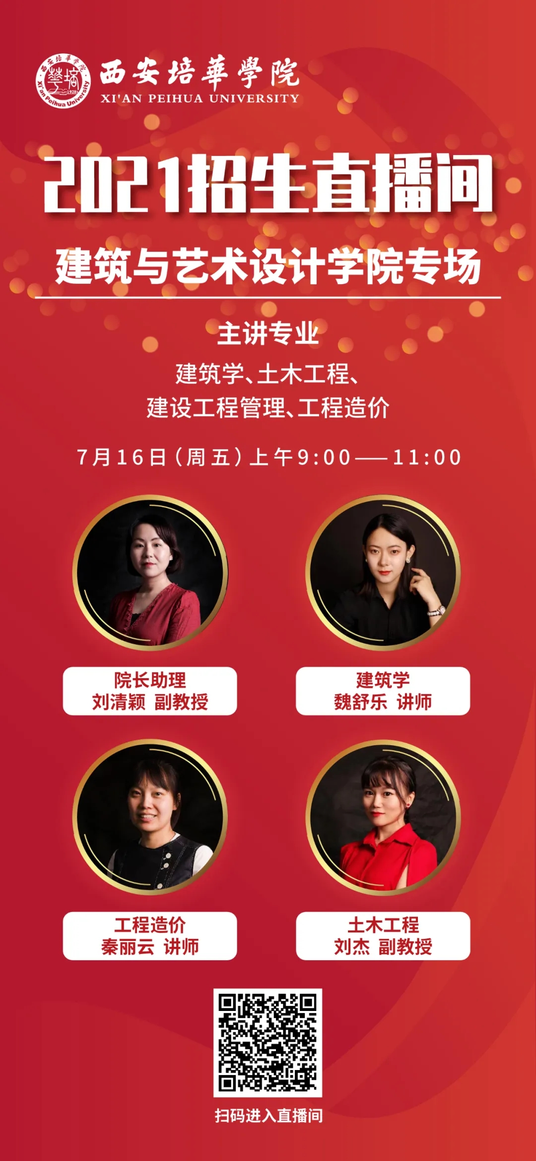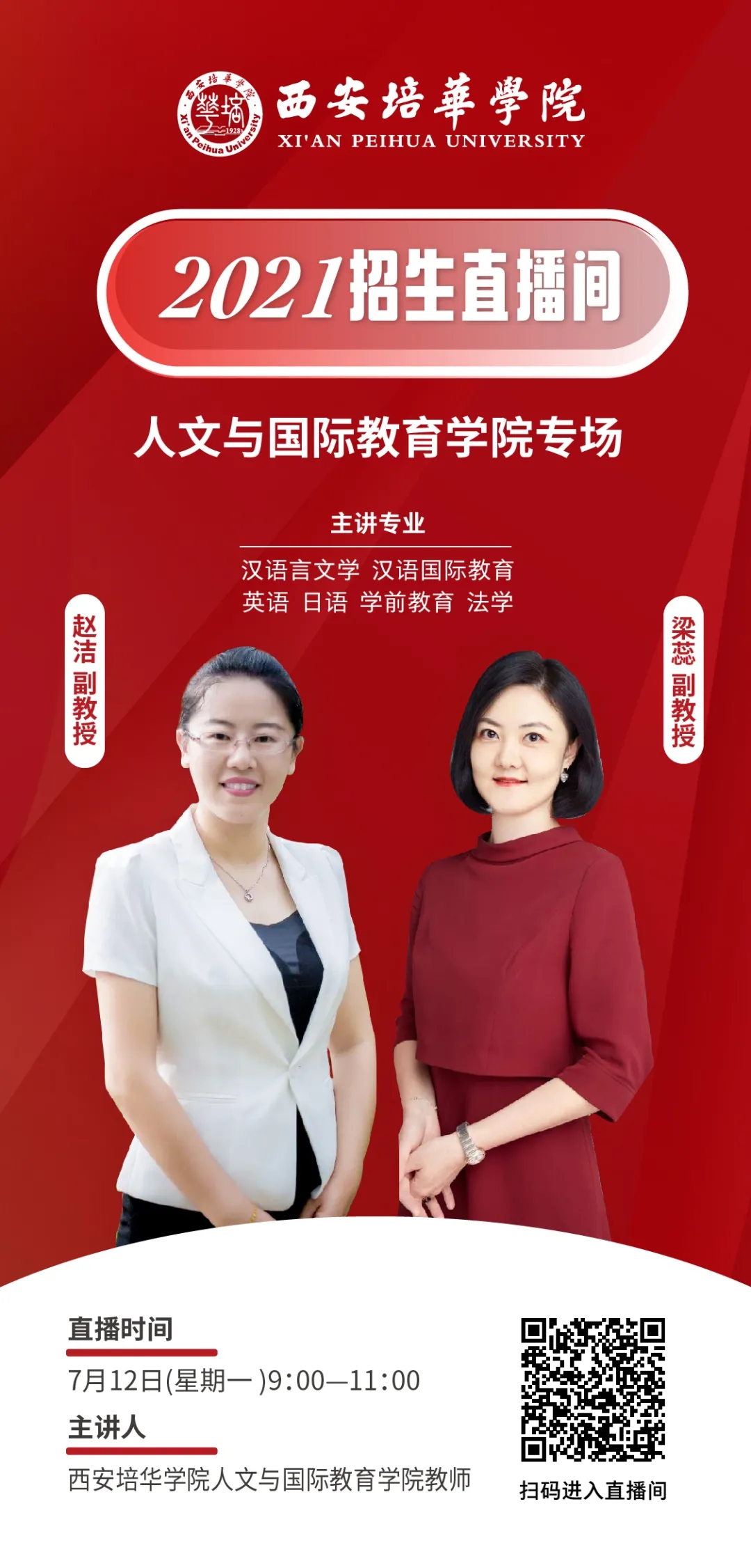 为方便广大考生,7月12日起,西安培华学院准备了招生宣传系列直播,内容涵盖高考志愿填报指导、西安培华学院招生政策解读、专业介绍等,扫描下方二维码即可观看精彩内容。