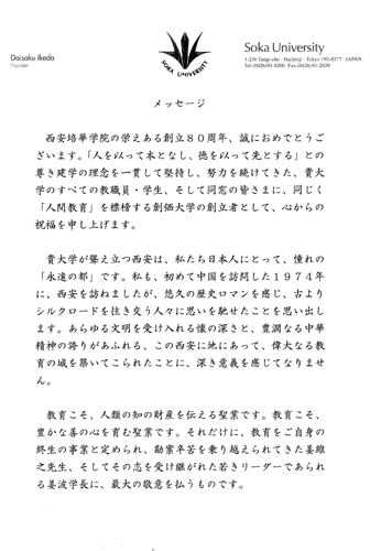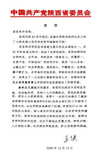 为庆典大会发来贺信及题词的领导有:全国人大常委副委员长、民革中央主席周铁农;全国政协副主席、农工民主党中央常务副主席陈宗兴;全国妇联主席、第十届全国人大副委员长、中国关工委主任顾秀莲;教育部常务副部长袁贵仁;国务院稽查特派员、中华教育艺术研究会理事长刘吉;国务院国资委国有资产监事会主席、北大国民素质研究中心主任解思忠;中国关工委副主任杨志梅;全国人大法制委副主任万绍芬;中国关工委执行主任、原中组部常务副部长王照华;原国家教委副主任、全国人大科教文卫委员会原副主任杨海波;原司法部部长邹瑜;原民政部部长崔乃夫;中国教育基金会理事长、原教育部常务副部长张保庆;中华国际民营企业促进会会长、原国家工商总局副局长、原国家工商行政管理局局经济检查司司长牛鸿瑞;中科院原副院长、中科院院士 2007国家科学技术获奖得者李振声;中国工程院院士孙九林;中华国际品牌协会会长、原中国质量管理协会理事长解艾兰;著名教育家、国学大师、演讲家、中华教育研究会常务副理事长李燕杰;陕西省省长袁纯清;陕西省委副书记、教工委书记王侠;原中共陕西省委书记张勃兴;原陕西省省长程安东;原陕西省政协副主席范明;日本执政党—公明党党首大田昭宏,日本政府内阁建设大臣国土厅长官中山正晖;日本创价学会名誉会长池田大作,京都市立艺术大学校长潮江宏三等。