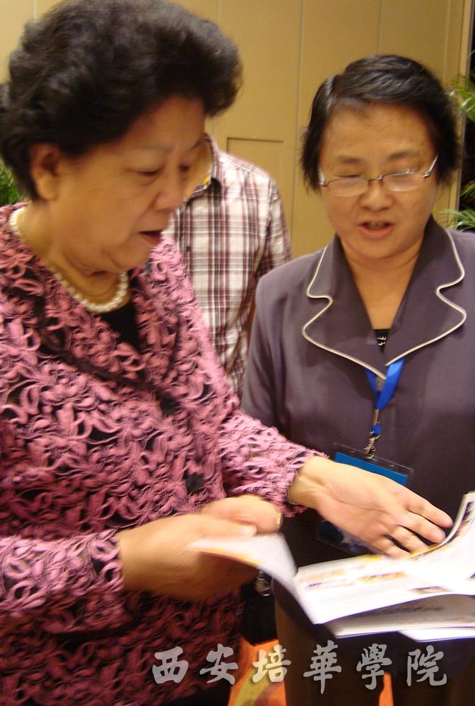 会议期间,全国人大常委会副委员长、全国妇联主席陈至立,全国人大常委会原副委员长、全国妇联名誉主席彭珮云详细听取了我校女子学院副院长金沙曼教授关于我校女子教育的历史、现状和鲜明特色的汇报,并详细询问了我校的创建历程和发展思路,鼓励我们一定要在女性教育方面积极探索,发挥民办学院的优势,做出特色和成绩,并分别在《西安培华学院女子学院》宣传册上签名。