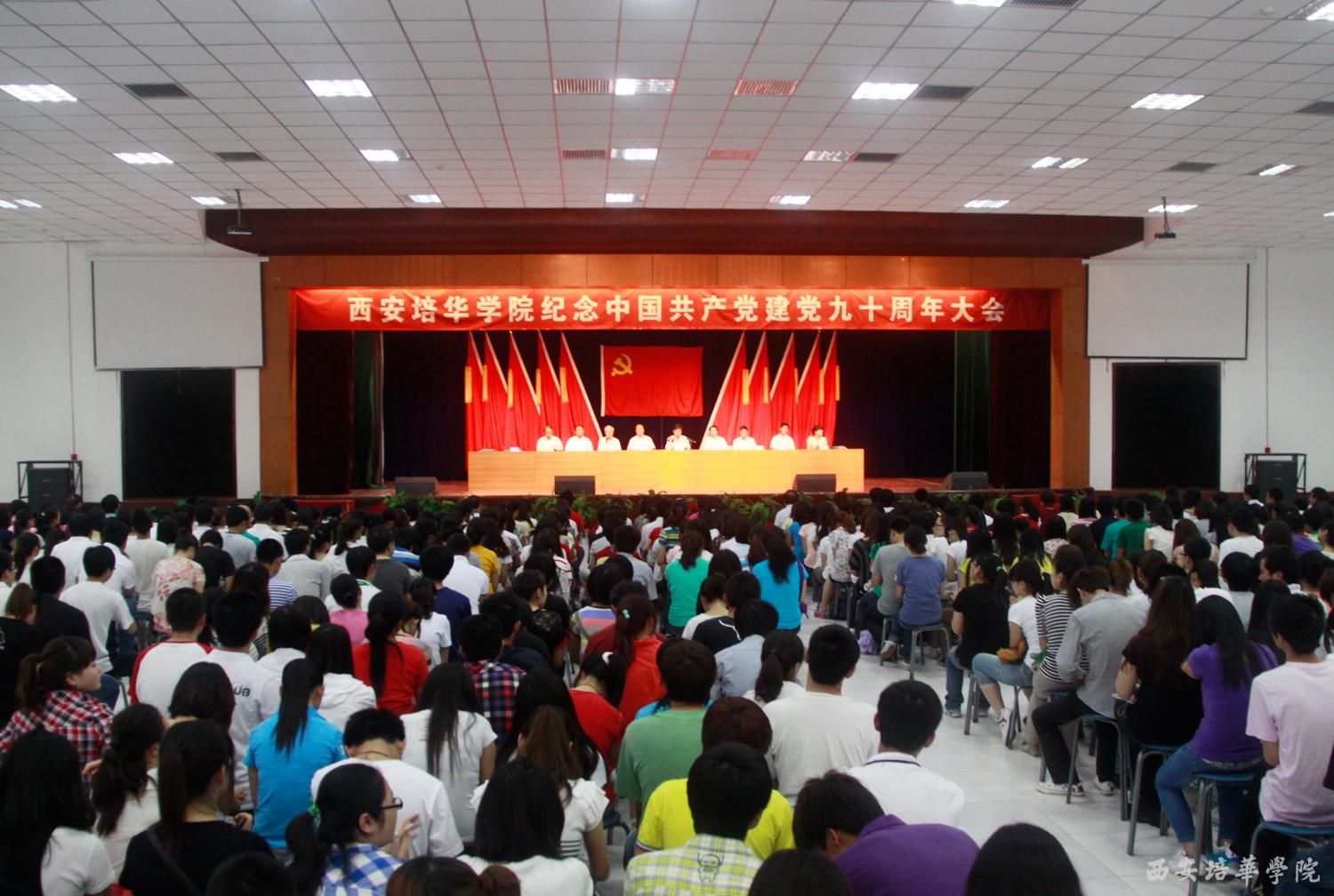 6月21日下午,我校长安校区大学生活动中心庄严肃穆,西安培华学院庆祝中国共产党成立90周年庆祝大会在这里隆重举行。主席台上方悬挂着鲜红的党旗和“西安培华学院庆祝中国共产党成立90周年庆祝大会”的主会标,10面鲜艳的红旗分列两侧,会场后方悬挂着“加强内涵建设,提升办学能力,努力创建高水平民办大学”的醒目标语。