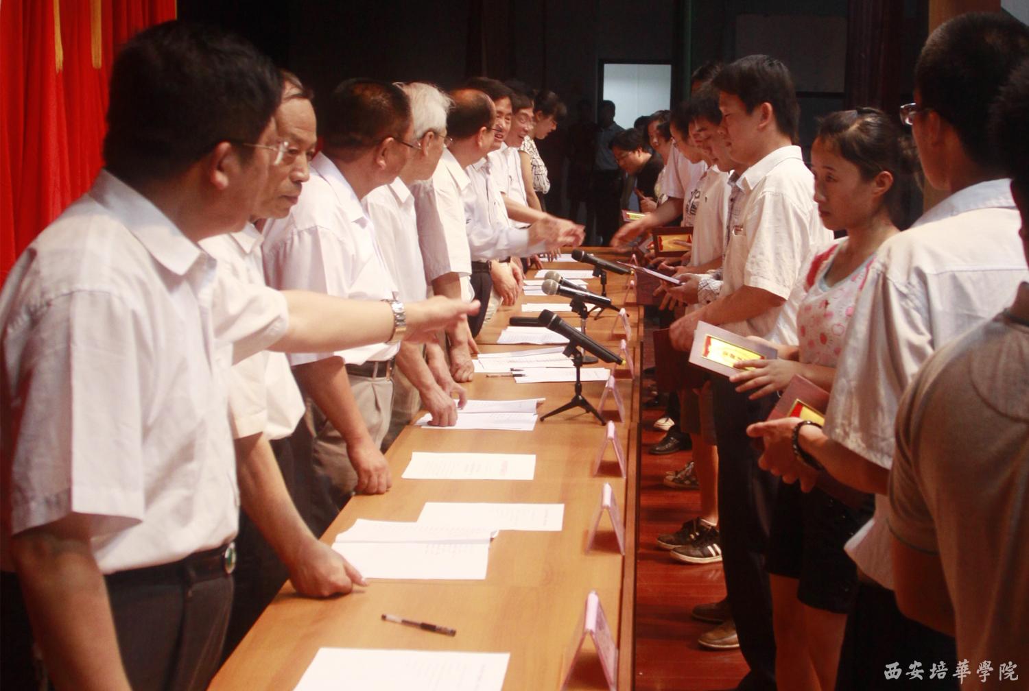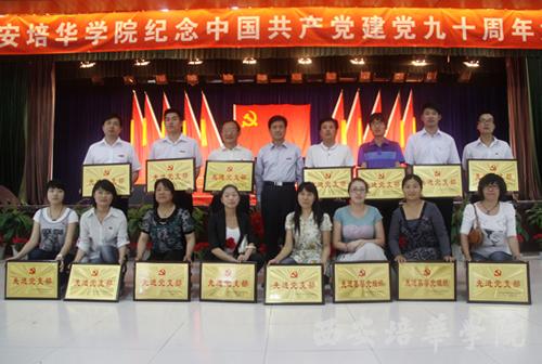 党委副书记、副院长陈胜秋宣读了《中共陕西省委教育工委关于表彰陕西高等学校先进基层党组织、优秀共产党员和优秀党务工作者的决定》和《中共西安培华学院委员会关于表彰先进基层党组织、优秀共产党员和优秀党务工作者的决定》。财会学院党总支、文法学院党总支、经济管理学院党总支被评为先进党总支部;机关第二党支部等13个党支部被评为先进党支部;屈阳等57名同志被评为优秀共产党员;高婷等5名同志被评为优秀党务工作者。随后,校领导依次为获奖单位和个人颁奖。