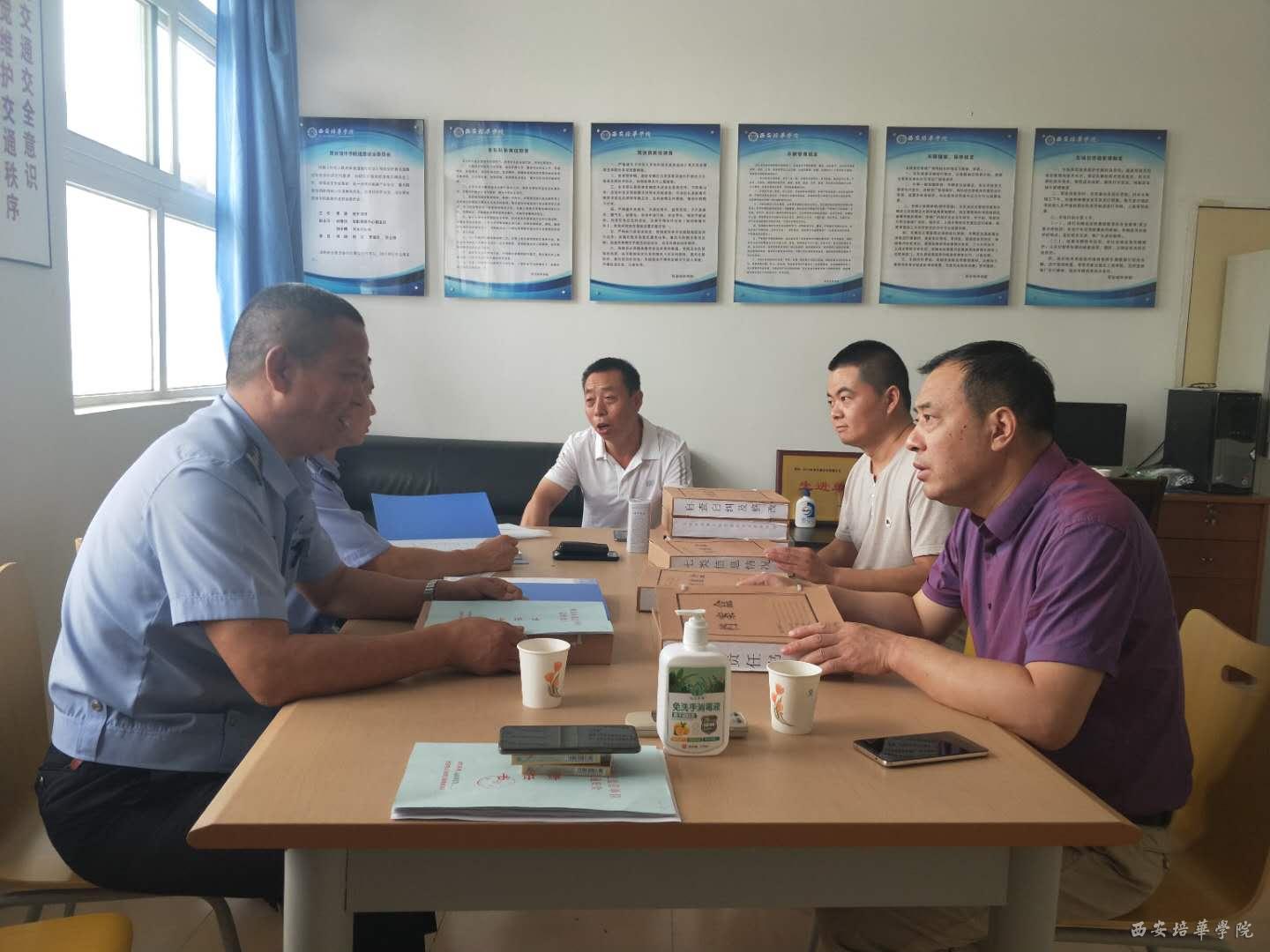 7月10日上午,西安交警高新大队安监科科长黄旭、民警吕卫鹏一行来我校检查校车队安全隐患排查工作,后勤服务中心主任助理李文生、校车队队长刘小明及全体车队驾驶员陪同检查。