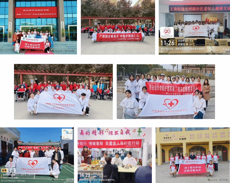 专业积极开展健康义诊、社区宣教、疫情防控、老年照护等志愿服务,用专业守护生命、用爱心温暖群众。毕业生以扎实技能、人文温度、责任担当奔赴医疗健康一线,为健康中国与区域卫生事业贡献力量。由护理系组建的西安培华学院南丁格尔志愿者服务队累计获批团中央项目2项,校级重点项目6项,发表新闻稿700余篇,撰写实践报告9篇,搭建大学生社会实践基地6个,孵化大学生创新创业训练计划项目3项,荣获2021年陕西省大中专学生志愿者暑期文化科技卫生“三下乡”社会实践活动标兵团队、2021年陕西省大中专学生志愿者暑期文化科技卫生“三下乡”社会实践活动优秀调研报告、中国南丁格尔志愿护理服务总队首届最美志愿护理服务风采展示组织奖,并入选2023年全国大学生“乡村振兴”志愿服务团队,2017年至今志愿服务遍及10个市、57个行政村、8家敬老院,有力推动了乡村健康事业发展。
