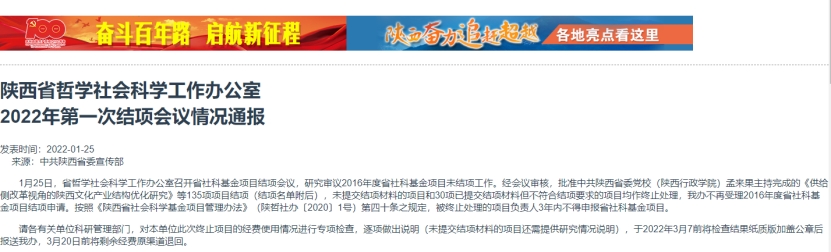 近日,陕西省哲学社会科学工作办公室召开省社科基金项目结项会议,研究审议2016年度省社科基金项目未结项工作。经会议审核,共有135个项目符合结项要求,准予结项。