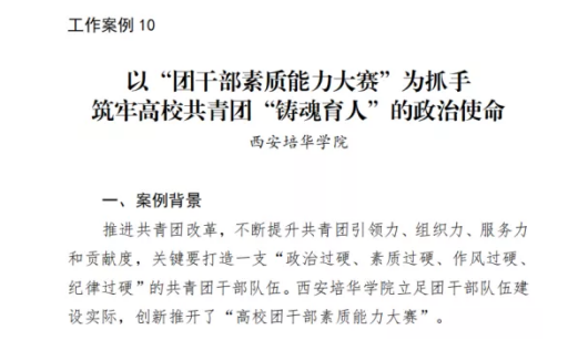 校党委进一步强化党建带团建,修订了《中共西安培华学院委员会2021年基层党建工作目标考核办法》,确立了对二级学院党委考核团建内容占比10分,校党委定期研究团学工作,配齐配强校院两级团干部队伍。