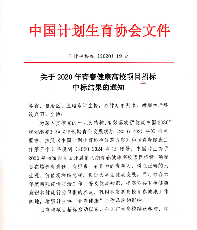 近日,在关于共青团科研项目的申报工作中,学校积极开展、广泛宣传,取得了新的突破。其中:学校申报的《陕西共青团“大公益”工作体系研究》课题(项目编号:054)在共青团陕西省委发布的《关于2021年全省共青团和青年工作研究课题立项的通知》中获得省级立项,;《健康青春,拥抱未来项目》(项目编号:237)在中国计划生育协会发布的《关于2020年青春健康高校项目招标中标结果的通知》中获得国家级立项,并由中国计生协提供项目经费(A类);《西安培华学院禁毒防艾社青春健康宣传教育项目》(项目编号:2021610100A000088)在中国性病艾滋病防治协会发布的《中国性病艾滋病防治协会2021年高校防艾基金拟资助项目名单》中被评为A类级别,并享受国家资助。