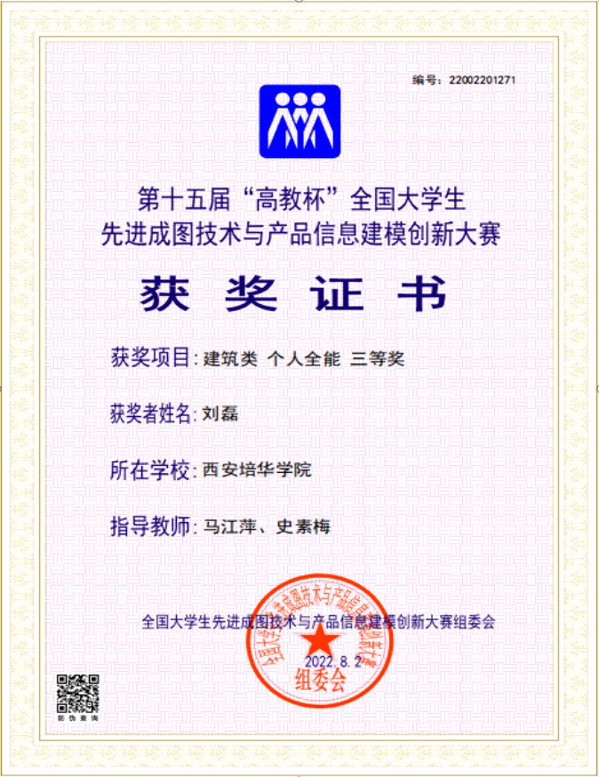 近日,第十五届“高教杯”全国大学生先进成图技术与产品信息建模创新大赛成绩揭晓。培华建筑与艺术设计学院代表队刘磊同学喜获建筑类个人全能三等奖。