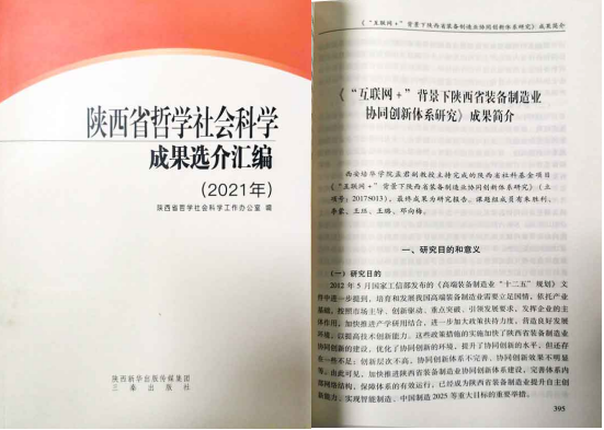 《2021年度陕西省哲学社会科学成果选介汇编》现已出版,我校孟君教授主持完成的成果《“互联网+”背景下陕西省装备制造业协同创新体系研究》成功入选。
