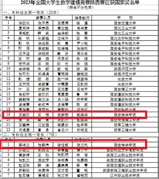 12月13日,陕西省教育厅办公室公布了2023年全国大学生数学建模竞赛陕西赛区获奖名单。我校共获国家级奖项3项,省级奖项15项,其中,智能科学与信息工程学院计算机科学与技术专业王鹏欢、王梅和安梦赫三位学生的作品获评本科组国家一等奖,计算机应用技术专业李泽文、张朝伟和陈旭哲三位同学的作品被评为专科组国家一等奖,计算机应用技术专业陈涛涛、王佳杰和边文杰三位同学的作品被评为专科组国家二等奖,同时,我校也连续两年获评陕西赛区优秀组织工作奖。