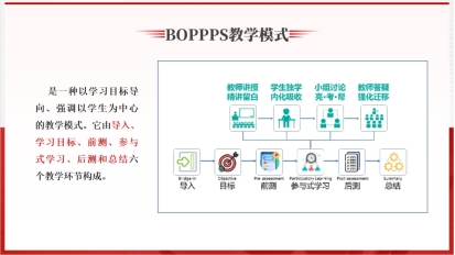 唐明老师谈到,OBE教育理念包含以学生为中心、以学生成果为导向、以持续改进为重点三要素,它是由导入、学习目标、前测、参与式学习、后测和总结六个教学环节构成的一种教学模式。