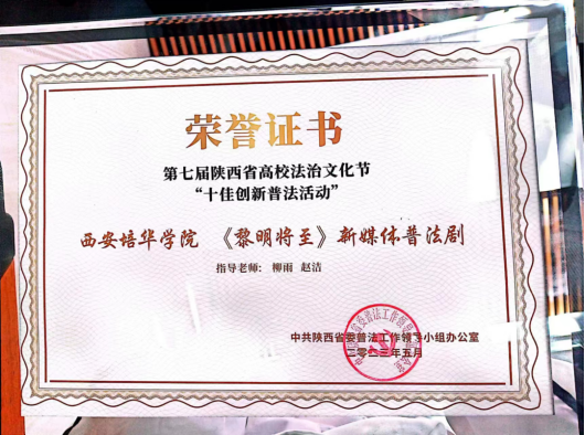 近日,第七届陕西省高校法治文化节落幕。由学校党委宣传部部长柳雨、人文与国际教育学院教学副院长赵洁指导的新媒体普法剧《黎明将至》荣获“十佳创新普法活动”,学校荣获“优秀组织单位”,张方成、张彩云同学分别获的“法典先锋”冲关答题趣味挑战赛一等奖、三等奖。