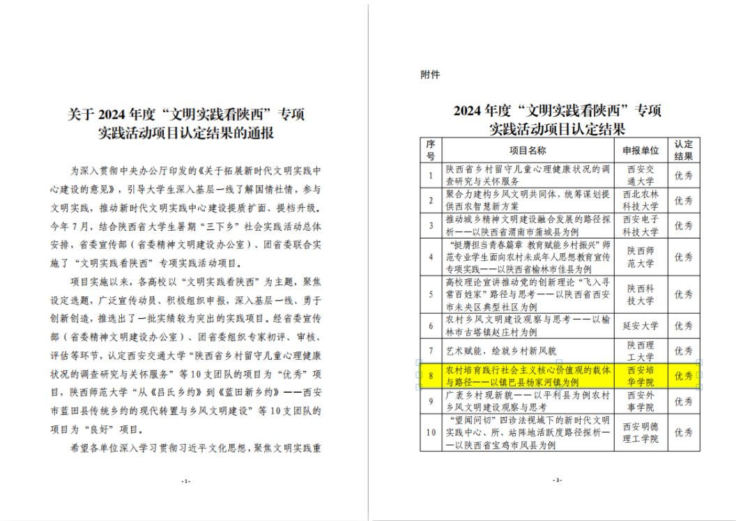 学校明法·夏日实践队的实践项目《农村培育践行社会主义核心价值观的载体与路径——以镇巴县杨家河镇为例》获评2024年“文明实践看陕西”专项实践活动“优秀”结项。