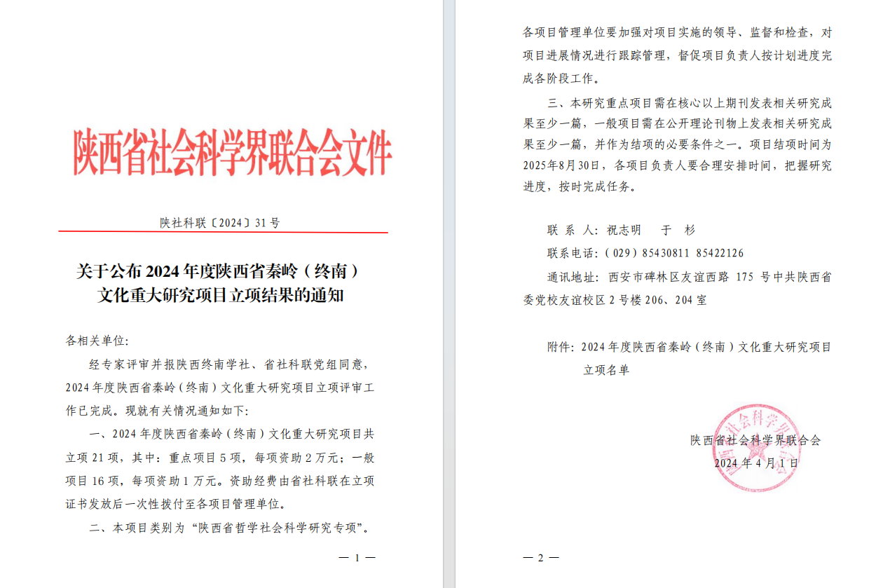 本次获批立项项目研究目标明确、方法科学、具有较高的创新性和实用性,对陕西省秦岭(终南)文化研究领域的学术发展及实际应用起到推动作用。