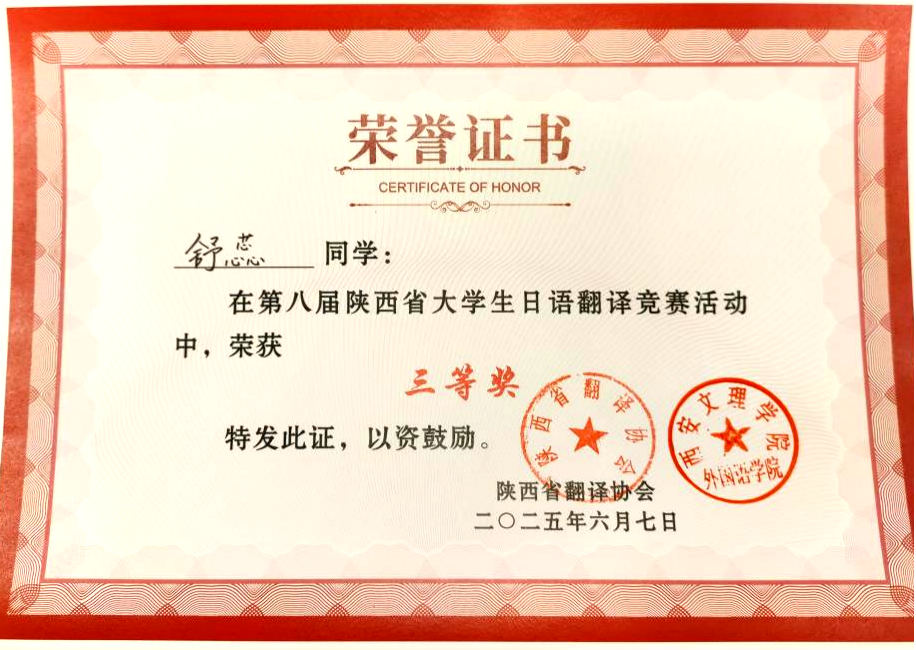 西安培华学院人文与国际教育学院外语系日语专业2022级舒蕊同学获三等奖,日语专业2022级黄强同学获得优秀奖。今后日语专业将持续深化日语专业教育教学改革,强化校际合作与行业交流,创新实践教学模式,着力提升学生翻译实践能力与跨文化交际水平,为培育更多高素质、专业化日语翻译人才,为推动区域外语教育事业高质量发展贡献积极力量。