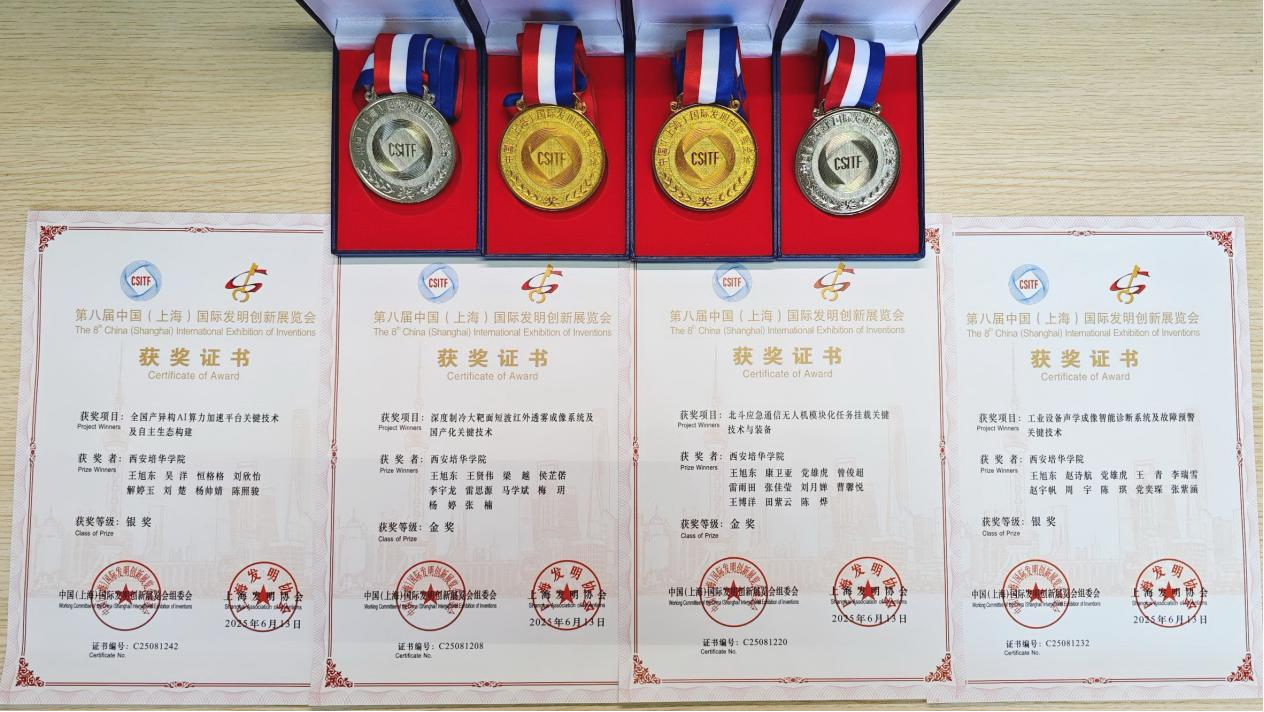 本次获奖的项目团队,聚焦应急通信、工业检测、算力国产化及光学成像等领域,深度整合学校校企合作与产教融合资源。其中,获得金奖荣誉的《北斗应急通信无人机模块化任务挂载关键技术与装备》依托模块化挂载与北斗短报文技术,为灾害“三断”场景提供通信中继解决方案;《深度制冷大靶面短波红外透雾成像系统及国产化关键技术》聚焦短波红外成像技术的国产化突破,实现复杂环境下的高清成像。获得银奖荣誉的《工业设备声学成像智能诊断系统及故障预警关键技术》通过无接触声音分析,实现设备故障精准预警;《全国产异构AI算力加速平台关键技术及自主生态构建》采用自主架构,为智能驾驶、医疗等领域构建可控算力生态。